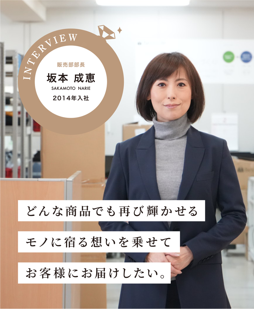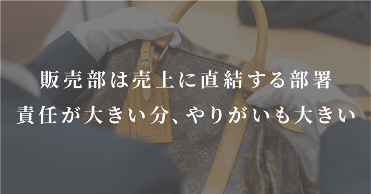 販売部に本格的に携わるようになったのは1年前。販売部は、買い取った品物を売上・利益につなげる重要な部署です。最初はその責任の重さに戸惑いましたが、社長や同僚、販売部のスタッフの皆さんに助けられながら、最終的には「私がやるしかない。どんなことがあってもやり抜く!」とポジティブな気持ちに切り替えることができました。責任は大きいですが、その分やりがいも大きいと感じています。単に言われたことをやるだけではなく、もっと良いやり方はないかと考え、小さな工夫を積み上げていくように心がけています。